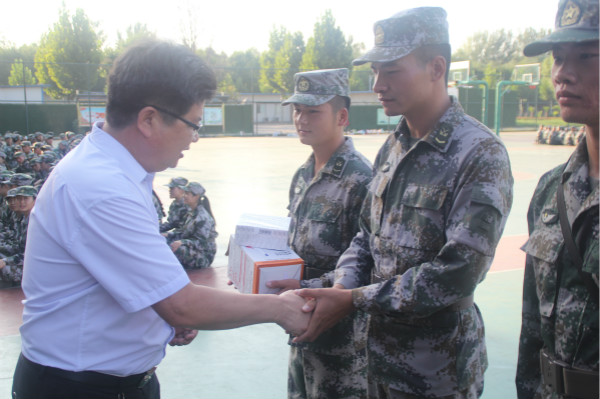 9月21日下午,tyc7111cc太阳成集团党委书记赵安勇、副书记杨军、正科级组织员李欣和19级新生辅导员一行来到军训现场看望慰问教官及新同学。