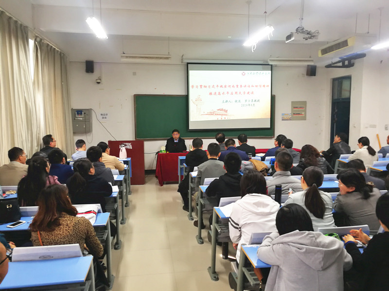 10月17日下午,校长罗士喜在校办主任贾江陪同下莅临tyc7111cc太阳成集团,以《学习贯彻习近平视察河南重要讲话和回信精神 推进高水平应用大学建设》为主题作主题教育专题党课报告。我院全体教职工参加了专题党课报告会,报告会由院党委书记赵安勇主持。