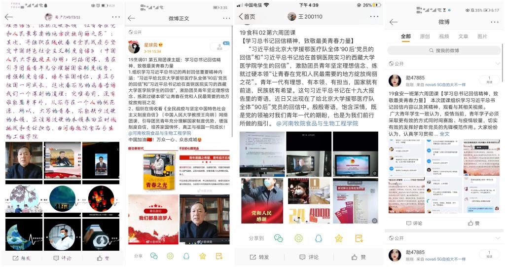 团课上,各班主持人组织大家学习习近平总书记的两封回信重要精神内涵:“习近平给北京大学援鄂医疗队全体‘90后’党员的回信”和“习近平总书记给在首钢医院实习的西藏大学医学院学生的回信”;组织在线收看《全民战疫与坚定中国特色社会主义制度自信》网络团课。19食科02班主持人带领大家学习了习近平总书记回信的重要精神后说“信中的殷殷寄语,既是党的领袖对我们青年一代的期盼,也是为我们前行所做的指引。”青年一代有理想、有本领、有担当,国家就有前途,民族就有希望。19生物01班同学们共同收看了《全民战疫与坚定中国特色社会主义制度自信》网络团课后意识到中国的制度优势,大家纷纷在留言区表达自己的自豪感。“自信人生二百年,会当水击三千里”青年是一个国家的脊梁,是一个名字的血液。青年更要勇于担当,扛起肩上的责任,“让青春在党和人民最需要的地方绽放绚丽之花。”同学们纷纷表示受益匪浅,未来要不断在磨难中成长,在历练中奋起!