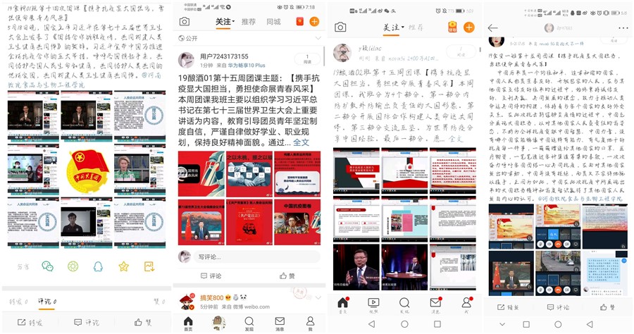 团课伊始,各班主持人组织同学们学习习近平总书记在第七十三届世界卫生大会上发表的《团结合作战胜疫情,共同构建人类卫生健康共同体》致辞,引导同学们对生命健康和构建人类卫生健康共同体的重视。其中,19食科03班主持人以带领同学们学习“人类命运共同体”理念为切入点,播放相关文章和视频。让同学们深刻意识到把生命安全和身体健康放在第一位的重要性,也学习了党在带领中国人民打好疫情阻击防控战的同时,积极参与和开展抗疫国际合作。同学们的观后心得体会非常深刻:祖国以实际行动彰显了党的初心和使命,责任与担当,自己也要传承祖国投桃报李的传统美德……19生物01班主持人呼吁同学们要学习抗疫英雄,并说他们是“无私奉献的“孺子牛”、吃苦耐劳的“老黄牛”、勇于创新的“拓荒牛”、本领高强的“铁牛”、不畏强手的“斗牛”。”最后让同学们分享自己的居家学习生活和居家防护小妙招。同学们滔滔不绝,积极参与讨论。此次团课在同学们激烈的讨论声中完美落下帷幕。