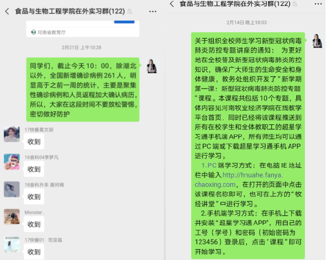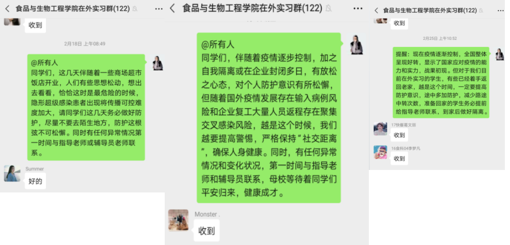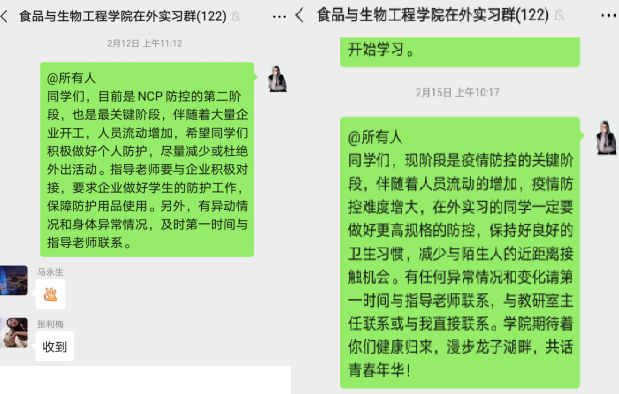 疫情发生后,学院第一时间统计在外实习学生状态,包括实习人数、分布区域、实习企业防护情况、学生身体状态及精神状态,并于2020年1月28日迅速组建微信群,采取实习指导教师和班主任双线管理,在做好实习指导的同时,将实习管理重心转移到学生健康防护上,尤其是对于在外地实习的学生,经常性发布疫情防护知识、注意事项等,对疫情相对严重和人员流动大的城市实习的学生,有针对性的重点指导。