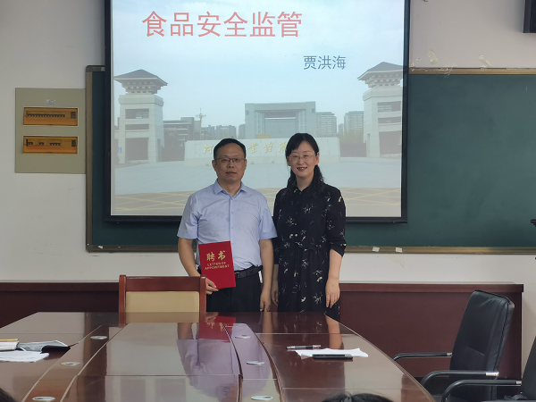贾洪海老师曾多年从事食品安全监管工作,现为全国市场监管执法人员培训讲师,中国食品安全报、中食药信息网、中食标准技术网、食品伙伴网等多个专业平台的特聘讲师。贾老师结合真实案例生动地介绍了食品安全监管的管理体制、监管法规、执法办案、行政处罚、食品标准、投诉举报等,接着介绍了网络食品的监管方式和困难,探讨了转基因食品的安全性。最后老师们针对食品安全监管的相关问题与贾老师进行了深入的交流沟通。讲座开始前,潘院长给贾老师颁发了tyc7111cc太阳成集团客座教授聘用证书,经协商双方今后将利用多种途径拓展师资锻炼渠道、开展课程建设合作,实现资源共享。