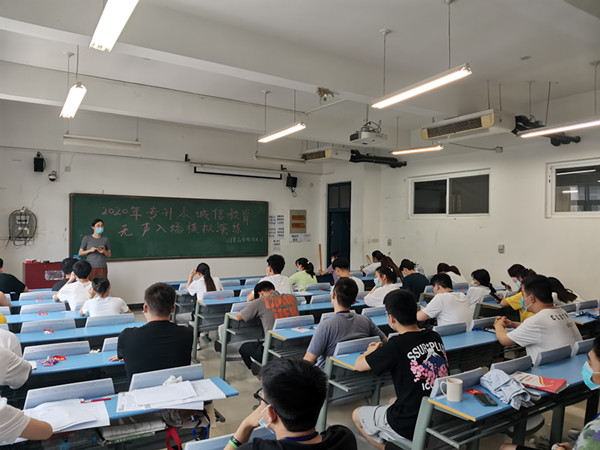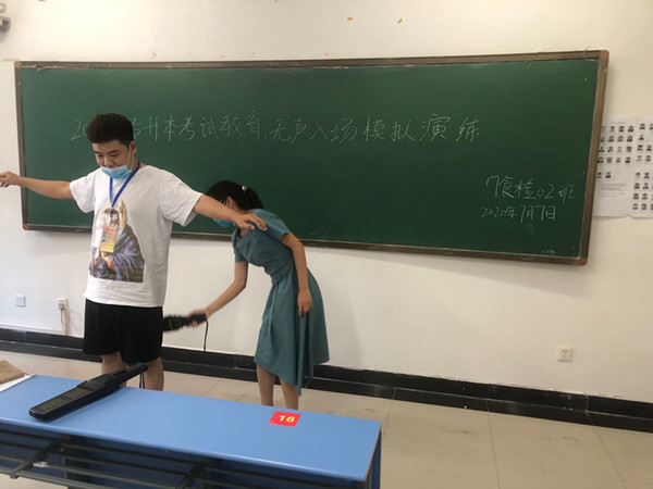 首先,带领考生学习《2020年普通高校招生考生诚信承诺书》、《太阳成tyc7111cc2020届学生参加专升本考试应考工作方案》文件精神与要求,并再次强调考试期间的相关纪律与要求;其次,要求每位专升本考生关注招生就业处微信公众号,方便考试结束后及时收到志愿填报、录取信息公示、后续手续办理等事项的通知;最后,专升本考生逐一接受老师的金属探测器检查,无报警声响方可进入教室。个别演练没通过的考生,及时更换合适的服装和鞋子,直至通过。