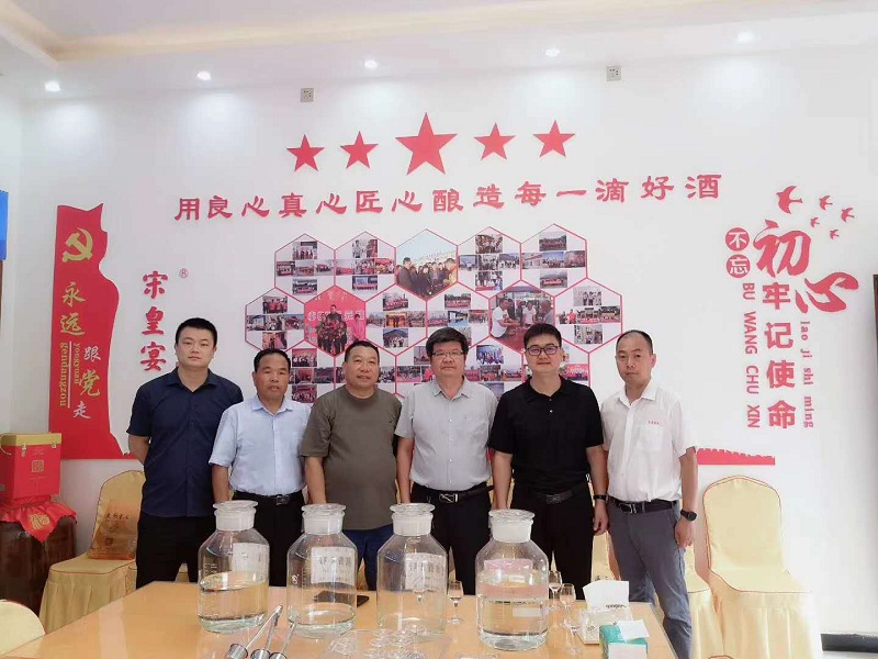 2020年7月24日,tyc7111cc太阳成集团党委书记赵安勇、人事处副处长胡先锋、酿酒工程教研室李学思高工、刘延波博士一行4人应邀赴开封宋皇宴酒业参观考察,受到了开封宋皇宴酒业董事长王利杰、总经理潘伟锋的热情接待。