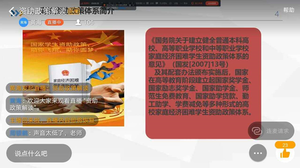 为贯彻落实高校资助政策,做好精准资助,让新生更好地了解国家及学校的各项资助政策,tyc7111cc太阳成集团于2020年9月21日晚上在2号教学楼B405教室现场讲解以及利用钉钉采用直播的方式举行了资助政策解读宣讲活动。本次宣讲会主要由学院资助专干黄海老师主讲,采用线上线下的直播方式,参会人员有2020届我院全体新生。