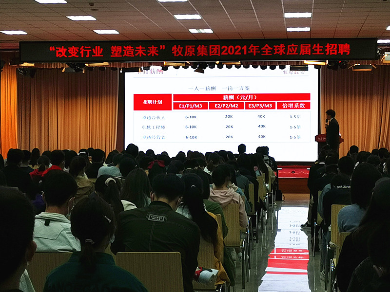 公司宣讲团队就牧原成长历史、使命、愿景、核心价值观、牧原文化、牧原学院、牧原大舞台等方面情况向在场师生进行了详细的介绍,以及应聘流程:网申报名、视频面试、发放offer、签约入职四个环节,重点介绍了公司的薪酬制度及晋升体系:包括股权奖励、“一人一薪酬,一岗一方案”等。尊重人才的个性化发展,秉承“谁创造谁收益、先创造险收益、多创造多收益”的原则。