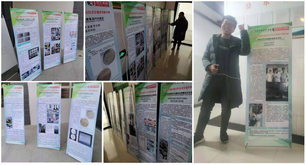总决赛答辩环节:12月24日下午,总结赛答辩暨颁奖典礼如期在生工组团A426会议室举行。我院党委书记赵安勇、双汇集团人力资源部部长赵亚茹、河南农业大学赵曼副教授、河南财政金融学院刘春雷副教授受邀作为大赛决赛评委。六支参赛队伍表现出色,逻辑思维清晰,实验结果与分析合理,回答问题科学流畅。其中,张震团队的课题《火腿中亚硝酸盐含量测定》实验方案设计合理,结果可信、自信大胆有创新荣获第一名,一等奖。张云龙团队课题《漆酶基因在大肠杆菌中的诱导表达条件优化及酶活分析》以及刘雪团队的课题《鸡肝脏组织Western杂交内参基因的表达》并列第二名,一等奖。其余三支队伍余倩倩团队、孙亚敏团队、王燕玲团队荣获二等奖。大赛评委现场为同学们颁发获奖证书和奖金、奖品。同时,20支参赛队伍制作了精美的实验作品海报,向校内外专家展示了我校学子不俗的实验技能和风采。