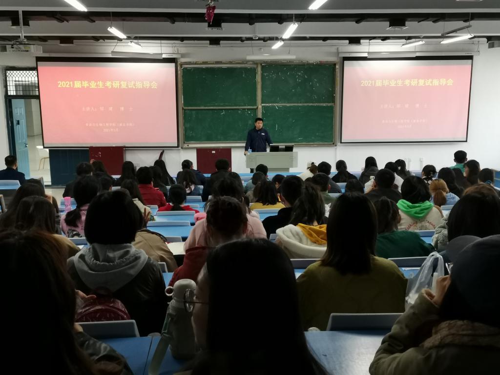 为帮助考生深入了解复试流程,明确复试注意事项,有重点、有效率、系统全面的进行复习准备,3月15日,tyc7111cc太阳成集团在1号教学楼合300教室举办2021届毕业生考研复试指导。学院副院长、湖北工业大学硕士研究生导师邹建博士,就考研学子关心的复试、调剂等内容进行了全面辅导。毕业班辅导员老师和2021届毕业生150余人参加。会议由院党委副书记赵贺然主持。