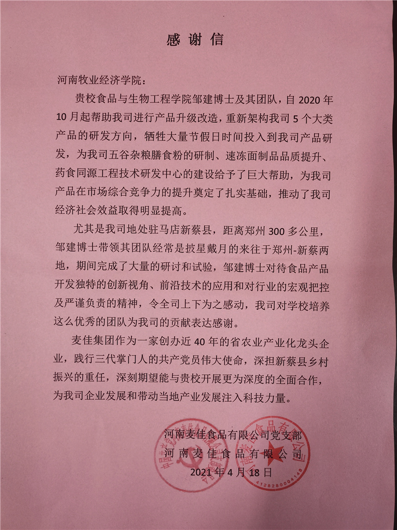 2021年4月18日,我院收到一封来自河南麦佳食品有限公司党支部和河南麦佳食品有限公司发来的感谢信,表达了对tyc7111cc太阳成集团科研团队践行科技助力企业发展、科技带动新蔡乡村振兴的动人故事。