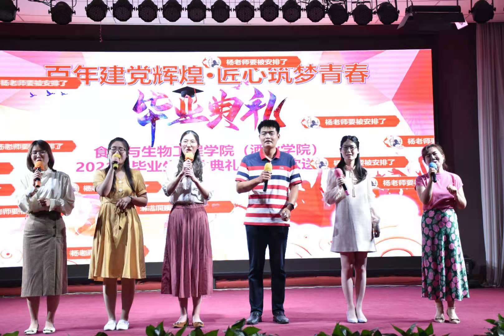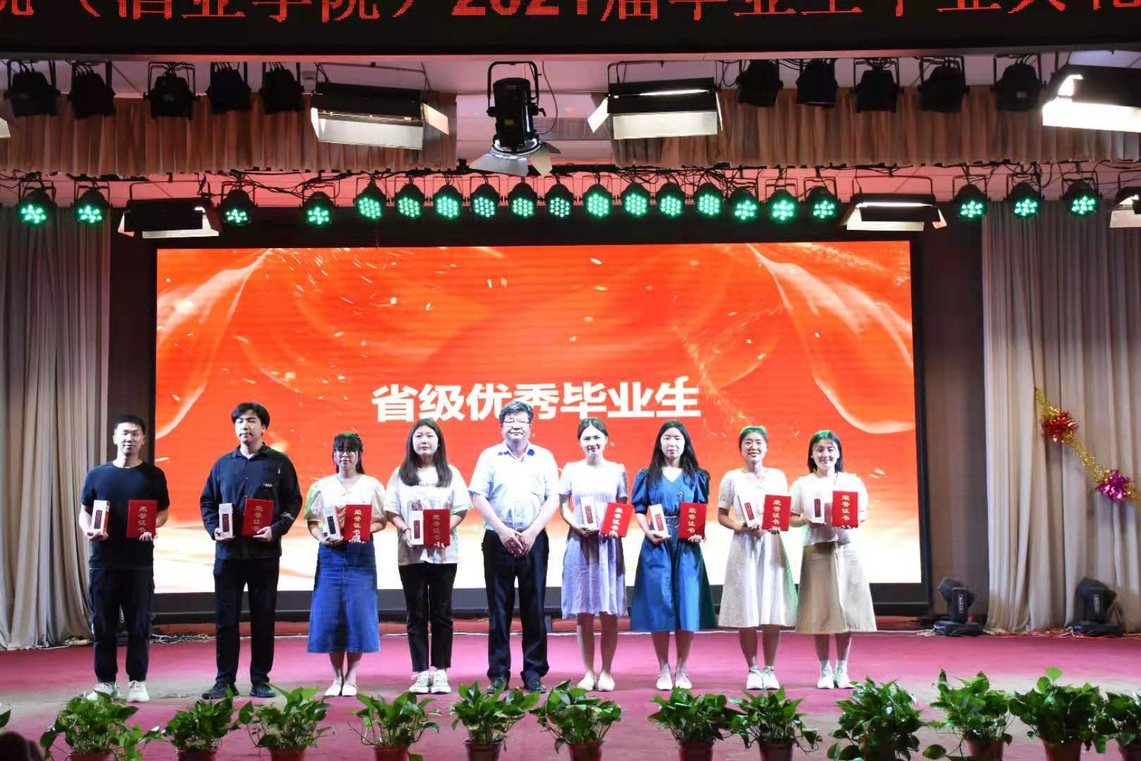 典礼在校现代舞团优美的舞蹈中拉开序幕。院党委书记赵安勇为毕业生们送上祝福,表达母校及老师对毕业学子们的殷切希望。紧接着,陈云飞等学生演唱歌曲《一生有你》,带来欢声笑语,副院长岳晓禹和高雪琴老师演唱《阳光总在风雨后》送给毕业生。之后,院领导们为省级优秀毕业生代表和校级优秀毕业生代表们颁奖并合影留念。邹健老师演唱的《再回首》让气氛达到高潮。院礼仪队精心准备的情景剧、王鑫、仲威宇等同学深情朗诵的《这个六月》将青春年华的朝气蓬勃展现的淋漓尽致。紧随其后的是院领导为毕业生代表颁发毕业证书及纪念品、拨苏正冠。17级团学委们献上歌舞《韭菜花儿开》,为自己的大学生涯画上完美的句号。晚会在院团委辅导员合唱的《再见》中圆满落幕。