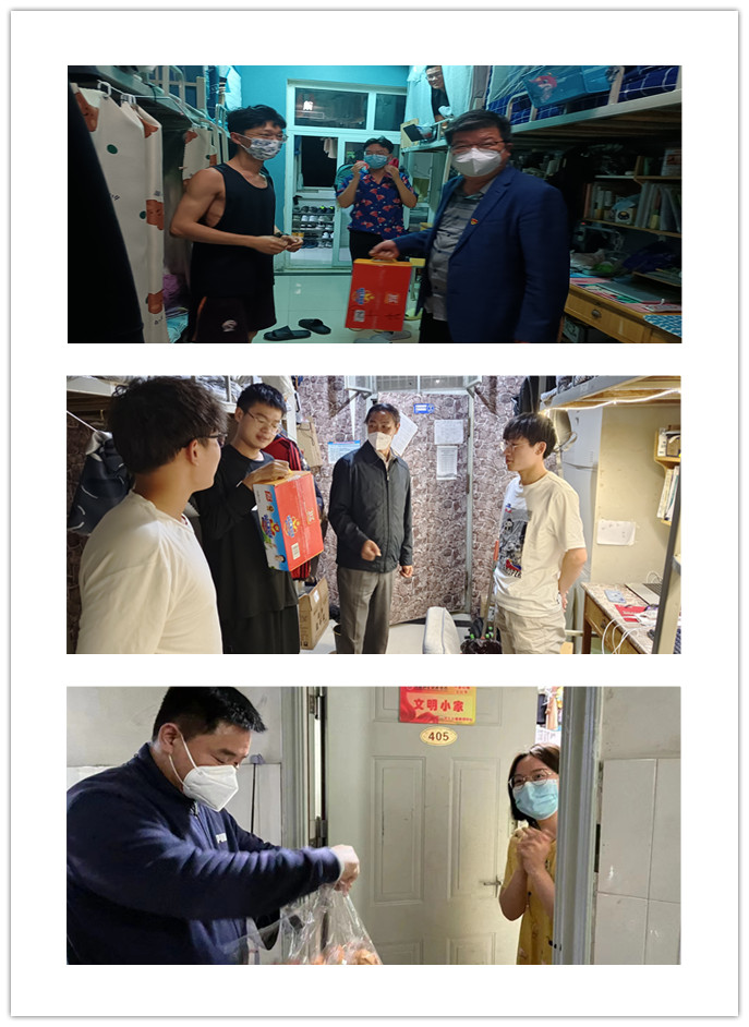 在紧张忙碌的抗疫工作中,学校领导多次看望慰问工作在一线的学院老师。校党委书记穆瑞杰、副校长杨志清、学工部部长郝景昊等同志多次到宿舍楼前指导抗疫工作,他们对身在一线的辅导员老师的工作表示认可和感激,要求辅导员老师特殊时期要把最温暖的爱带给学生,工作中要注意方式方法,并叮嘱老师们要做好个人防护,注意劳逸结合。老师们备受鼓舞,认真把学校的抗疫工作要求落到实处,主动深入学生,切实解决学生关切问题,用心守护好学生的健康与安全。学院领导也多次到学生宿舍走访慰问,了解学生的生活状况和困难,增强同学们的抗疫信心。同学们深受感动,表示一定配合学院做好各项工作,一起打赢这场疫情阻击战。