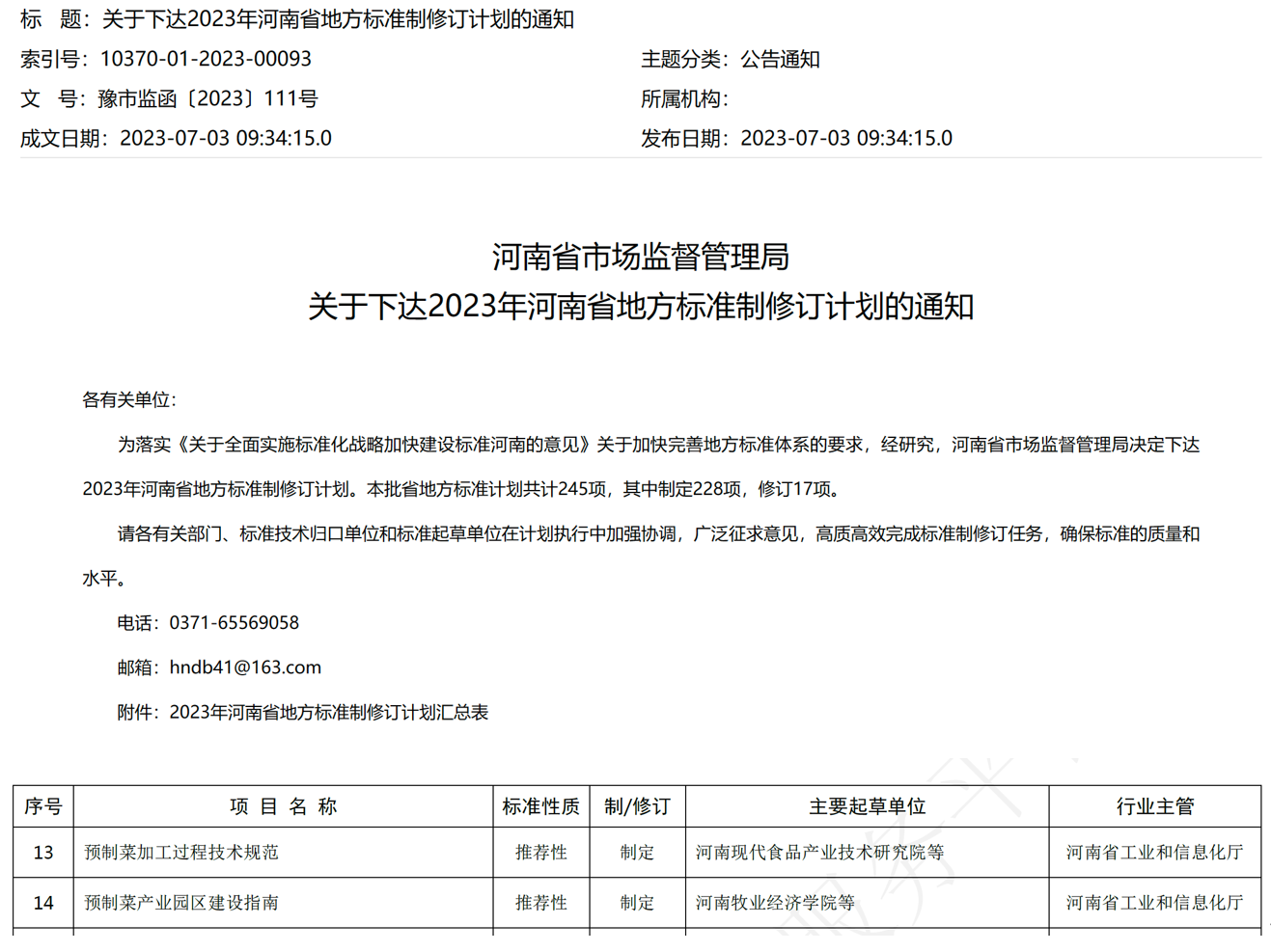 为落实《关于全面实施标准化战略加快建设标准河南的意见》关于加快完善地方标准体系的要求,近日,河南省市场监督管理局下达了2023年河南省地方标准制修订计划。本批省地方标准计划共计245项,包括制定228项,修订17项。经前期近4个月的讨论、确定题目、初审、正式申报、答辩等环节,我校在预制菜领域共立项2项地方标准。这是预制菜团队再次在该领域获得的重要突破。