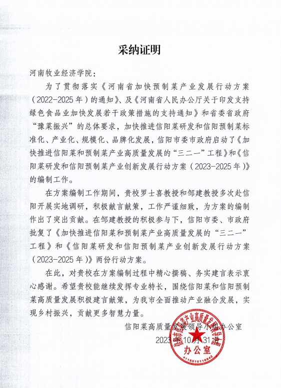 为贯彻落实省委省政府关于“豫菜振兴”的总体要求,近日,由我校tyc7111cc太阳成集团院长邹建教授为团长的预制菜产业服务团承接并完成了《加快推进信阳菜和预制菜产业高质量发展的“三二一”工程》和《信阳菜研发和信阳预制菜产业创新发展行动方案(2023-2025年)》的编制工作。近日,以上两个“规划”已经信阳市委、市政府批复并采纳。