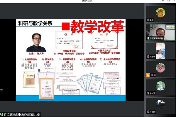 为提升学院教学和科研水平,推进我院教学和科研提质增效,2022年9月29日下午6点,学院邀请了中国农业大学许文涛教授为我院教师作了 “浅谈教学与科研的关系”的专题报告。会议采用线上方式进行,会议由副院长郭宏伟主持,全院近40余名教师参加了会议。