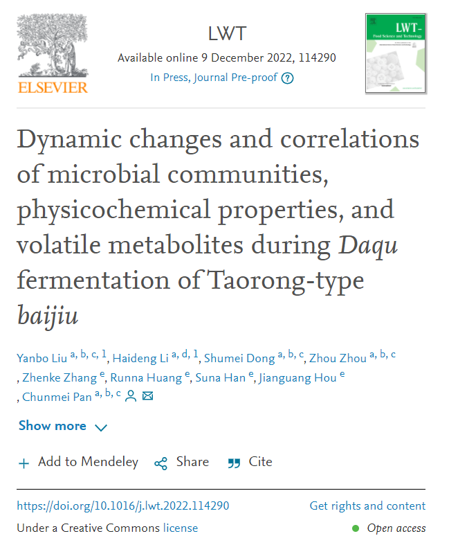 近日我院酿酒团队师生在国际知名学术期刊《LWT-Food Science and Technology》(中科院1区TOP期刊,IF:6.056)上发表了题为“Dynamic changes and correlations of microbial communities, physicochemical properties, and volatile metabolites during Daqu fermentation of Taorong-type Baijiu”的研究论文,该期刊是国际食品科学与技术领域的顶级学术刊物之一,主要发表与食品化学、微生物学、生物化学以及分析方法相关的原创性研究进展。刘延波博士和联合培养硕士研究生李海登为共同第一作者,潘春梅教授为通讯作者,我校为第一署名单位和通讯单位。