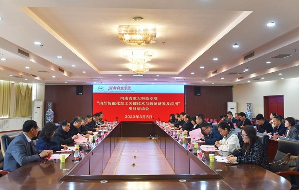3月5日,河南省重大科技专项“肉品智能化加工关键技术与装备研发及应用”启动会在河南科技学院召开。省科技厅现代农业农村科技处处长李锦辉,河南科技学院副校长贾积身,河南科技学院科技处处长、项目主持人马汉军教授出席会议。参加会议的还有来自郑州大学、河南农业大学、 太阳成tyc7111cc、河南双汇投资发展股份有限公司等10多家单位的专家学者及课题组成员40余人。作为子课题承担单位之一,我校肉品团队的郝修振教授、高雪琴博士受邀参加了会议。